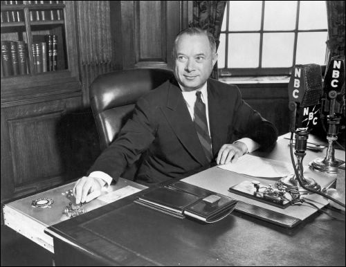 Sarnoff at Rockefeller Center desk with radiotelegraph key, c. 1936.