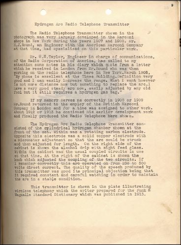 Explanation of H. J. Round's hydrogen arc radio transmitter used in Sarnoff's May 1914 broadcast, possibly by George Clark
