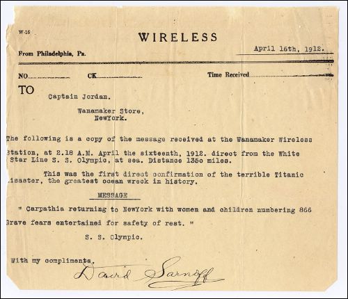 First of three telegrams sent by Sarnoff and his team regarding Titanic survivors
