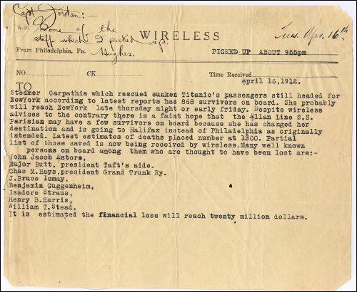 Another telegram sent by Sarnoff's team regarding Titanic survivors