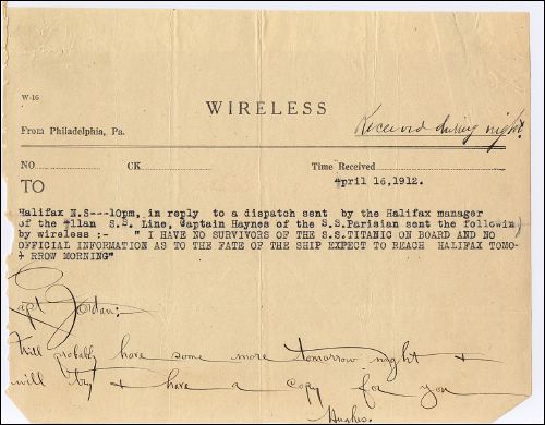 Another telegram sent by Sarnoff's team regarding Titanic survivors