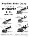 This was about $600,000 better than the instrument volume for the same period. Instrument Line From 1901 to 1905, the company offered its domestic trade 12 different instrument models ranging in list from $15.00 to $100.00. Trade discounts are not known, but were probably 55% for the distributors, 40% for small dealers, and 40 & 10% for large dealers. The most noticeable changes in product development had to do with the method of supporting the horn, and the evolution of the horn itself. However, far and away the most important development during this period, one of the most important developments in the company's history in fact, was the "taper tone arm and goose neck," introduced in 1903. This feature had the following advantages: 1. Because of the ball-bearing mountings, it enabled the sound box to track across the record almost without resistance. 2. The hinging of the "goose neck" made it possible to carefully determine the pressure of the sound box on the record, and made it much easier to change needles. 3. While the scientific reason for it wasn't known at the time, the performance was much improved. (p. 55) This was due to the fact that the additional distance and gradual expansion of the air-chamber from the sound box to the end of the horn provided a modification of the exponential principle used years later in the Orthophonic Victrola. Domestic instrument volume from 1901 to 1905 increased as follows: