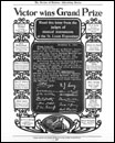 To a talking machine enthusiast, the "sound box" of a talking machine carried something of the importance and glamour of a chronometer. Individuals prized particular units as, for no particular reason, being the best that had ever been made. Even the company's executives took great pride in showing and playing a box which had come out of the company's experimental laboratory. Several of the company's best mechanics spent years of their lives working behind closed doors making up boxes in every conceivable size and weight and with every fulcrum variation that was suggested or could be thought of. While the great bulk of the company's production was equipped with Concert, Exhibition, No. 2, and Orthophonic boxes, there was a total of about 15 variations which were used in one connection or another. Advertising The company ran a back cover in the "Saturday Evening Post" on July 12, 1902. On April 25, 1903, it followed up with the first "double truck" ad ever run in the Post. The company again ran a back cover in the Post on April 9, 1904. Interspersed was a series of smaller advertisements. In an attempt to strengthen and enlarge its distribution, nearly all of these advertisements listed the company's distributors. The bold use of large, conspicuous, space had the dramatic effect of putting the spotlight on the new enterprise, and of giving it an apparent importance in line with the largest companies in the country at that time. The practice of using special positions became established practice. After 1910, practically all of the company's extensive advertising in the Post was in big, important space-most of it double spreads and back covers. Victor traded heavily on the power of curiosity and suspense. From the earliest days, records were issued once a month. They were announced or put on sale prior to a specified date. Instruments were put on sale nationally, with a fan-fare, on a specified "Opening Day." There was a build-up. Something important would happen on a particular day. The trade and public apparently loved it and waited expectantly. Every effort was made. of course, to make the wait worth while to avoid a let-down. (p. 56) Then, remarkable results were obtained by featuring an unexplained "secret process" which may not have been anything more important than the important matter of using materials which were a little better than actually required, and workmanship which was painstaking in every minute part of the product. From 1901 to 1905, exposed horns were available in many sizes and shapes: black horns, black horns with brass flanges of varying proportions, all brass horns, flower ("Morning Glory") horns, and, as a top development, horns in oak and mahogany ply-wood. In view of the complications which had existed between the Berliner Company and Mr. Seaman-which had indirectly and, to some extent, directly involved Mr. Johnson-it is significant that Mr. Seaman, who was also an advertising agent in New York, should have made a serious play in February or March of 1901 for Victor's advertising account. It is also significant, in another way, that the Armstrong Agency should have held the account against all comers from 1901 to 1925. It was, however, no coincidence. Vendors and others who served the company fairly and to the best of their ability were not easily dislodged. License to Sell From 1896 on, Mr. Johnson had met up with many of the rough sides of business-pirating, counterfeiting, misrepresentation, double dealing, patent infringement, loss-leader sales, etc. From a practical point of view, none of these problems concerned him more than loss-leader sales. For, whereas there was some legal recourse against the others, the position of a patented product with regard to the Sherman Act had not been clarified. Mr. Johnson and his lawyers took the position that it didn't make sense for the government to give an inventor a patent monopoly for 17 years and then leave him without protection against destructive elements in the trade. Victor was among the first to strongly advocate fair trade practices and they vigorously fought the issue for about 15 years. They argued that the public's interest against gouging by the manufacturer was protected by the inventor's self-interest because the price and product had to be acceptable to the public if the inventor was to survive. One of the company's top legal advisers stated his own and the company's point of view as follows: