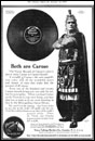 This session turned out to have been one of the most important, if not the most important, in the history of recorded music. For instance: 1. The Gramophone Company made a profit of £15,000 on the sale of these ten records. 2. The record "E Lucevan Le Stelle" got Caruso his first contract with the Metropolitan Opera Company in New York. Mr. Conried, Manager of the Met, heard it in the Gramophone Company's Paris office, took it to New York, and cabled Caruso his first contract. Caruso made his debut at the Met in "Rigoletto" on November 23, 1903. 3. The records had important influence in melting the prejudice, which big name artists still had against recording their art. 4. If Victor advertising over the years gave Caruso valuable publicity (Fig. 20), his name as an exclusive artist brought prestige to Victor. 5. His records, backed by exclusive Victor advertising, effectively stimulated the public's interest in serious music. 6. His contract with Victor was very helpful in building up the Red Seal catalog. 7. The fee of £100 for the Milan recording led ultimately to royalties to Caruso in excess of $3,000,000. Caruso got $4,000 for the first 10 records he made in Camden (shortly after his first appearance at the Met), $10,000 for the next 10, and forty cents a record, with an advance on royalties of $10,000, for the next 10. Caruso was 29 years old in 1903. Record Development If there were any records of Red Seal caliber in Victor's Catalog in 1901, there probably were not many. The last page of the bulletin of 10-1-01 announced that a group of records of this kind would "soon" be available by importation. The first published list of the kind which has been located was probably issued in 1903, and most of the listings were from imported matrixes. (p. 53) (Figure 20) The records Caruso made in Camden apparently marked the beginning of the active development of the domestic "Red Seal" recordings. One important artist after another was added to the list until the domestic section of the catalog became much more important than the imports. By 1906, the following artists had been signed on an exclusive basis: