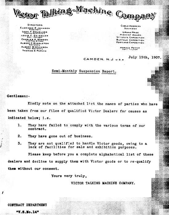 Figure 23 (p. 64)-Semi-monthly suspension report issued by the Victor Talking Machine Company-1907.